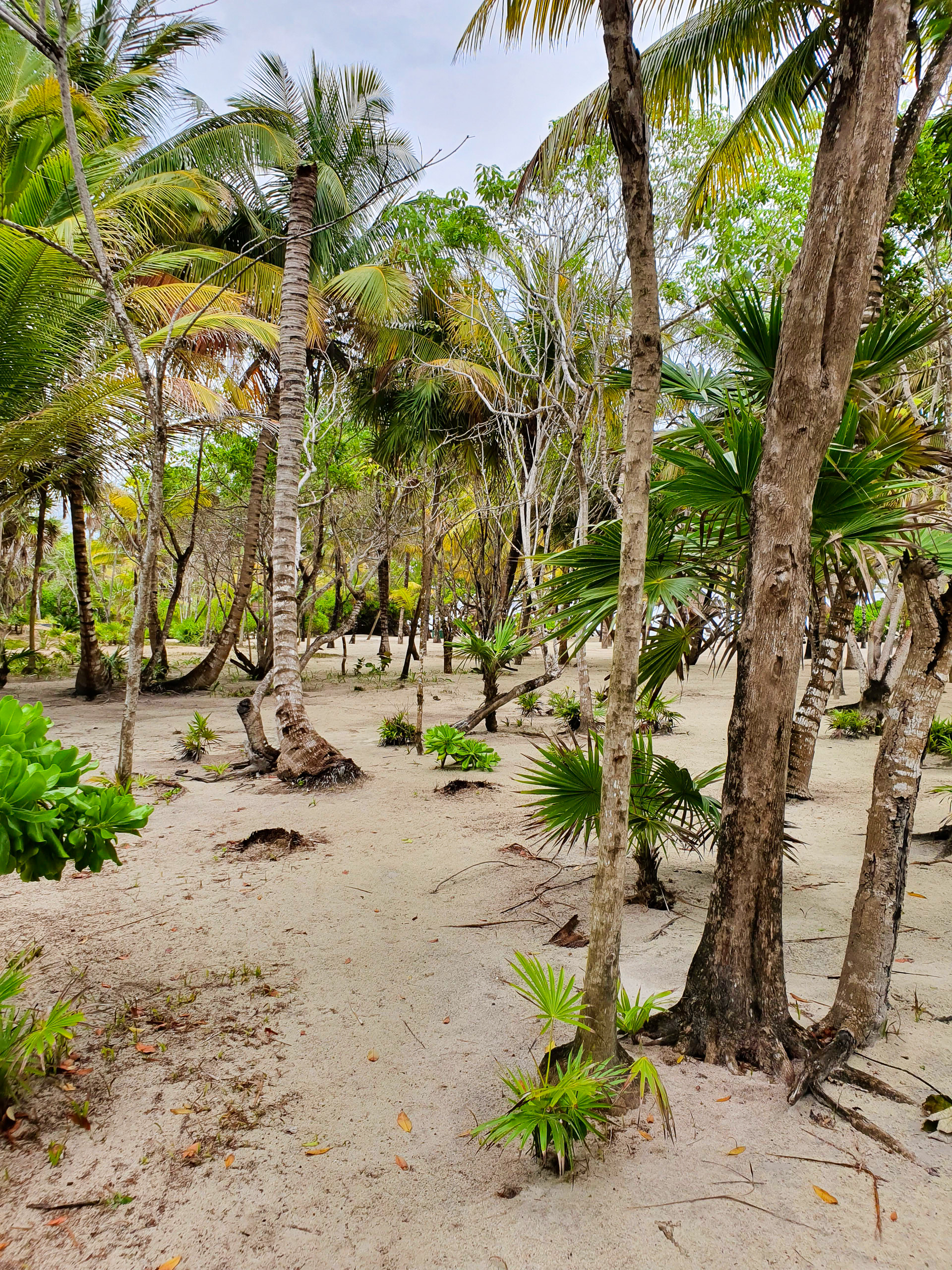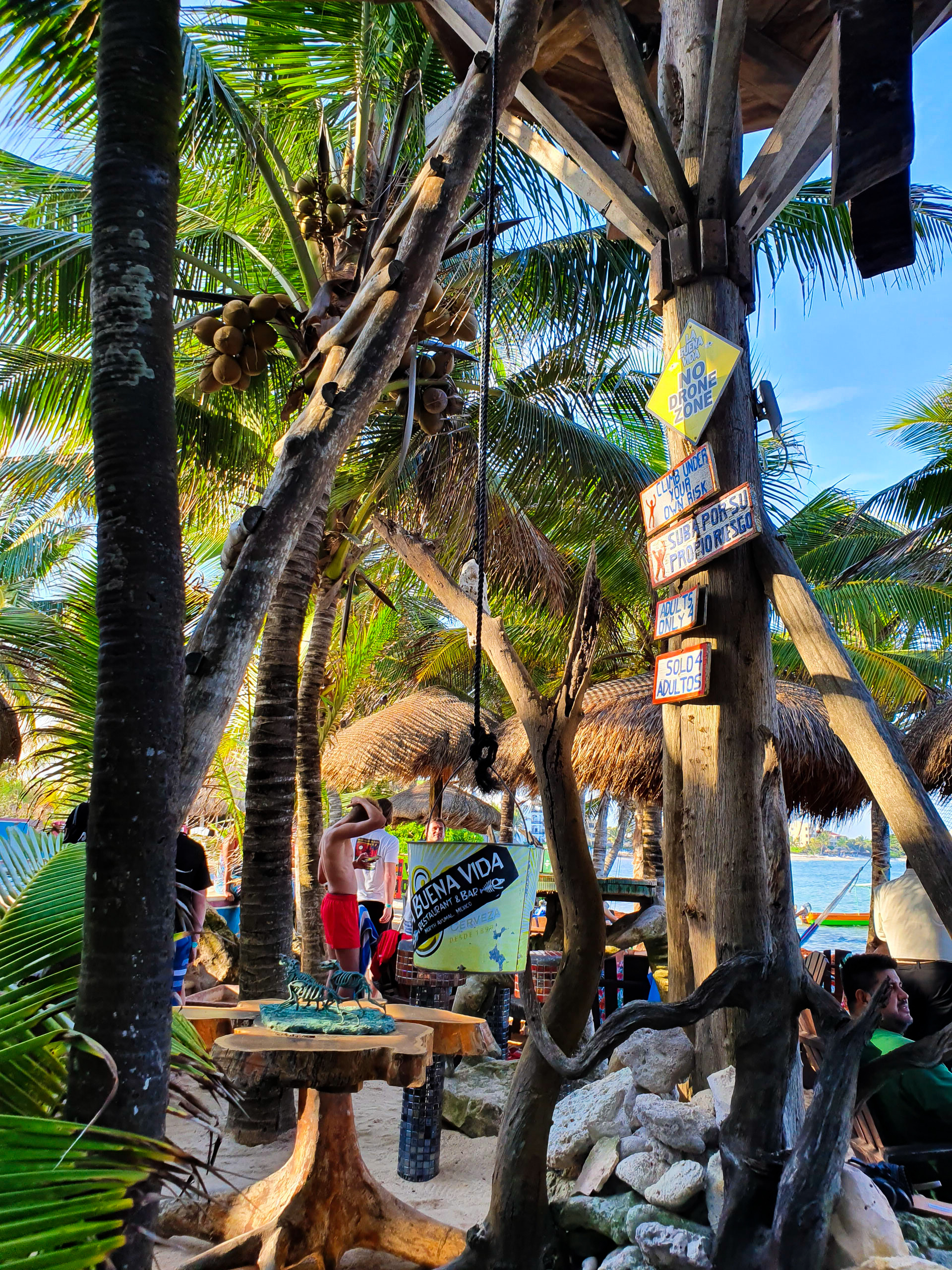 Tulum selbst (man muss unterscheiden zwischen Tulum Pueblo und der Beach Road, die über viele Kilometer am Strand entlangführt – in unserem Fall meine ich die Straße) hat mich zunächst etwas verschreckt (ich habe am ersten Tag bereits jegliches Schminken aufgegeben, hatte fast ausschließlich ein einziges Kleid an, das möglichst wenig Stoff an sich hatte, auch über nasse Bikinis angezogen werden konnte und meine Haare waren in einen, von dem Cenoten-Getauche ständig nassen Zopf gebunden), weil es wahnsinnig touristisch und super hip ist. Überall sieht man die Instagrammer in Pose geworfen, alle sind durchgestylt und furchtbar cool. Außerdem herrscht ziemliches Verkehrschaos, man kommt nur langsam voran. Nach der ersten, unmittelbaren Abneigung kam dann aber doch so etwas wie Begeisterung auf. Die Läden und Bars entlang der Straße sind so liebevoll hergerichtet, die Straße selbst ist von Palmen und Dschungel beschattet und man kann sich nicht sattsehen an den hübschen Details. Leider ist Anhalten mit dem Auto nahezu unmöglich. Wir haben einen kurzen Stop für eine Runde Eis (sensationell) und an einem Abend auch einen Restaurantbesuch eingelegt, weil davor gerade eine Parklücke auf der Straße frei wurde. Enttäuscht wurden wir aber nicht, in der Gegend scheint einfach jegliches Essen gut zu sein. Und geschmacklich werden einem wirklich neue Welten eröffnet. An dieser Stelle muss ich euch das Ka’an nahelegen, mir hat es bei unserem ersten Besuch wirklich den Atem geraubt. Wenn man der Beach Road bis ans Ende folgt, kommt man an den Eingang zu einem Naturreservat bzw. Nationalpark, Sian Ka’an. Links das Meer, rechts eine wunderbare Lagune (übrigens mit Krokos, wie wir festgestellt haben. Und zwar großen.) Von dort sind es noch einige Kilometer Fahrt auf einer holprigen Sandstraße, bis man bei dem Strandrestaurant Ka’an ankommt – Loungemöbel unter freiem Himmel, eine Bar, Essen ausschließlich über dem Feuer zubereitet und lokale Zutaten. Eine einmalige Erfahrung.