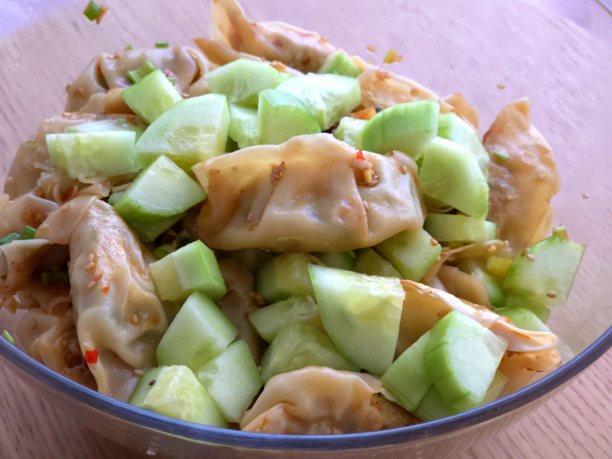 Die Dumplings normal anbraten, Gurken in Stücke und Frühlingszwiebeln in Ringe schneiden und das Dressing aus Sojasoße, Reisessig, etwas (wenig) Wasser und nach Geschmack und Lust Chili, Sesam, Ingwer und etwas Knoblauch dazugeben. Alles zusammenmischen und fertig ist der lauwarme Dumplingsalat.